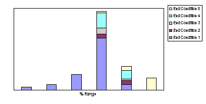 Post-run processing of output from Monte Carlo runs may be carried out using the tool studProcess [Smi97]. Using studProcess it is possible to correlate various parameters output to file by SWARMM and create histograms of those parameters. For example, there are a variety of conditions that will prevent a missile from successfully intercepting a target and these are output to file [Tur97]. It is therefore a simple matter to post process results obtained from a large number of Monte Carlo runs and collate the missile failure reasons against parameters such as range at launch, target delay in reacting to missile launch, etc (see Figure 2). This will enable the analyst to determine the effect of such parameters upon the success of the evasion manoeuvre.